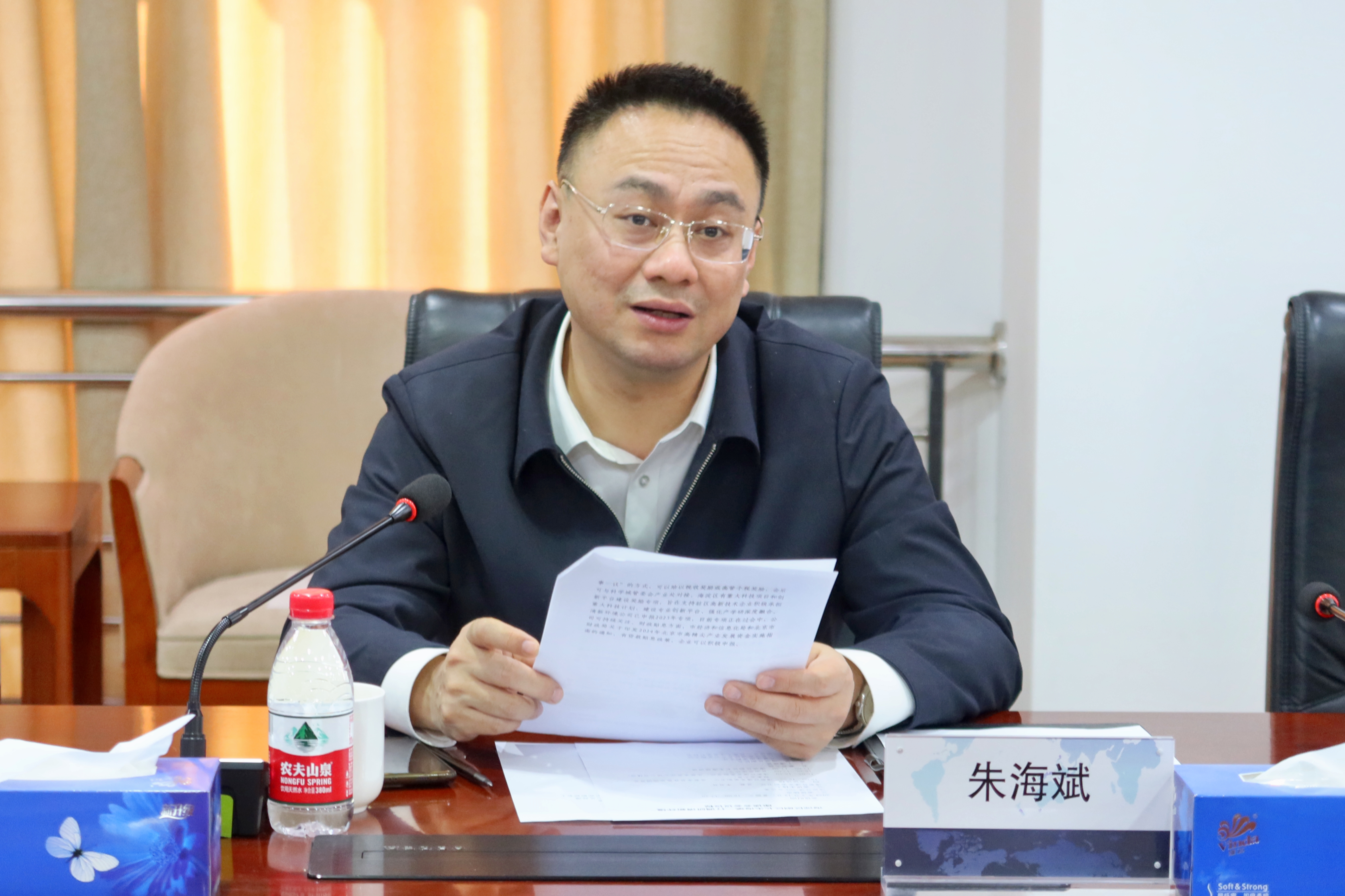 李其林对朱海斌一行的到来表示热烈欢迎,并代表清新环境对海淀区政府、中关村科学城、八里庄街道长期以来对公司发展的大力支持表示感谢。李其林介绍了公司生产经营情况,并就市场开拓、科技创新等重点工作进行了汇报。他表示,政企合力、共赢发展,清新环境将持续为海淀区生态环保和经济发展贡献“清新力量”。