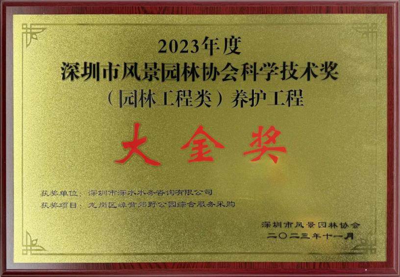 近日,2023年度深圳市风景园林协会科学技术奖(园林工程类)获奖名单正式揭晓,清新环境子公司深圳市深水水务咨询有限公司(以下简称“深水咨询”)龙岗区嶂背郊野公园综合服务项目荣获“养护工程大金奖”,这是深圳市风景园林行业的最高荣誉,也是对深水咨询综合服务工作的高度认可。
