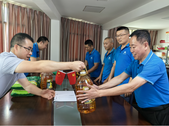 新疆金派党支部组织开展“八一送温暖,慰问传真情”活动。活动过程中,党组织书记与退役军人亲切交谈,仔细聆听,认真了解他们的工作情况和生活情况,叮嘱他们要注意生产安全,并送上大米、清油等慰问物品,感谢他们的付出与贡献。大家纷纷表示今后将继续积极发扬军人的优良传统和作风。