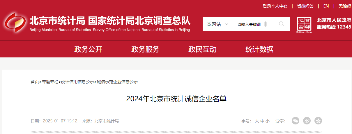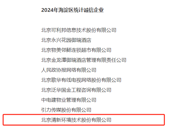 日前,北京市统计局公布了各区“2024年北京市统计诚信企业”。北京清新环境技术股份有限公司(以下简称“清新环境”)凭借扎实的统计工作基础、严谨的数据处理流程以及对诚信原则的坚守,在参选的400家单位中脱颖而出,成为11家获此殊荣的单位之一。这是清新环境首次获此殊荣。