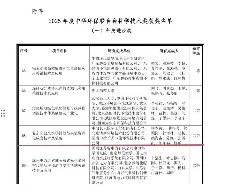 近日,根据《国家科学技术奖励条例》《社会力量设立科学技术奖管理办法》(国科发奖〔2023〕11号)和《中华环保联合会科学技术奖奖励办法(试行)》的规定,2025年度中华环保联合会科学技术奖评选结果正式公布,清新环境凭借核心技术成果荣获科技进步奖二等奖。